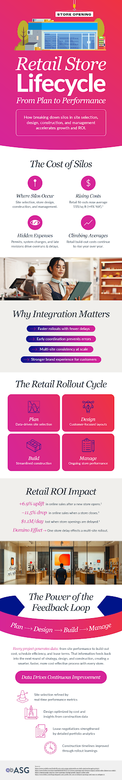 After opening, performance management becomes the priority. Sales data, foot traffic, labor efficiency, and inventory turnover provide insight into how well the store meets its goals. Ongoing adjustments to merchandising, staffing schedules, and local marketing help refine results over time. Regular reviews of operating costs and lease terms keep the store financially aligned as conditions change. A retail store lifecycle succeeds when planning decisions connect seamlessly to daily performance, creating a location that adapts, competes, and delivers consistent value well beyond opening day. Look over the infographic below for more information.